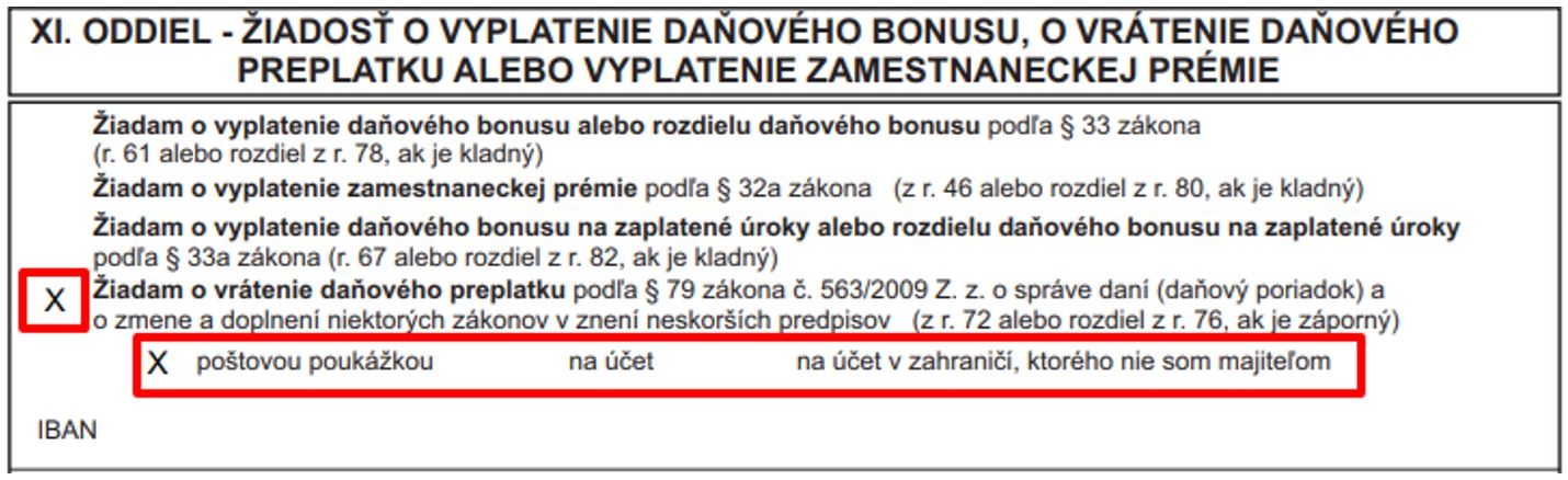 - typ A - v oddiele XI. - Žiadosť o vyplatenie daňového bonusu, o vrátenie daňového preplatku alebo vyplatenie zamestnaneckej prémie,