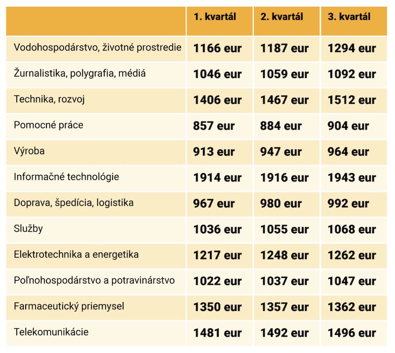 Najvýraznejšie medzikvartálne zvýšenie platov zaznamenalo vodohospodárstvo a životné prostredie. Mzdy sa tu oproti predošlému obdobiu zvýšili o takmer desatinu na 1 294 eur. Platy v ponukách rástli výrazne tiež v textilnom a odevnom priemysle, umení či v prekladateľstve.