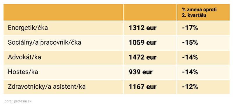 Naopak, v prípade energetikov/čiek sa ponúkané mzdy menili smerom nadol. Oproti druhému kvartálu klesli o 17 percent. Podobne to bolo aj v prípade sociálnych pracovníkov/čiek, advokátov/tiek či hostesov/siek.