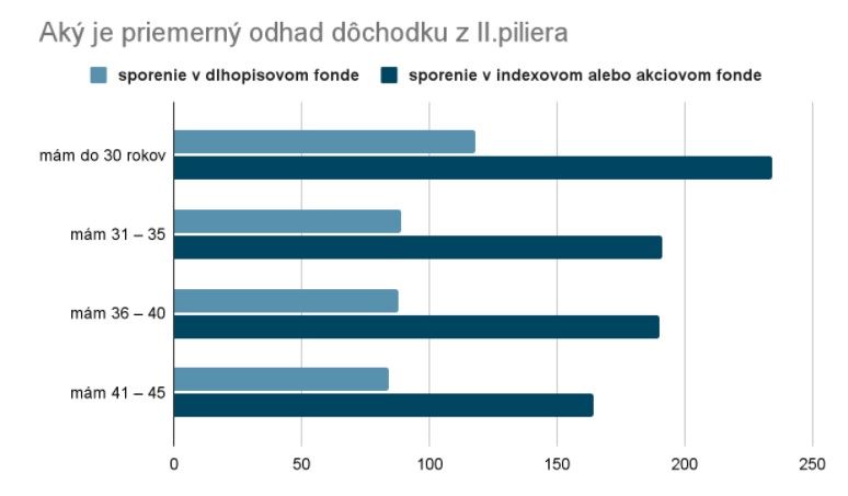 Graf zobrazuje odhad priemernej výšky dôchodku z dlhopisových a negarantovaných fondov v II. pilieri – indexového, akciového a zmiešaného podľa súčasného veku sporiteľov, v €, prepočítané na súčasné ceny.