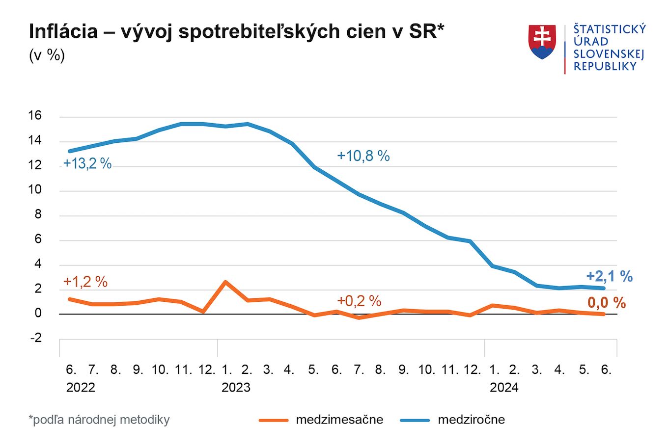 V júni 2024 sa spotrebiteľské ceny tovarov a služieb udržali na májovej úrovni, pričom medzimesačný rast cien sa od začiatku roka postupne spomaľoval a dosiahol nulovú hodnotu. Medziročná inflácia osciluje okolo 2 % od marca tohto roka a v júni rovnako ako v apríli dosiahla 2,1 %, čo predstavuje najnižšiu hodnotu inflácie za posledné tri roky. Informuje o tom Štatistický úrad SR.
