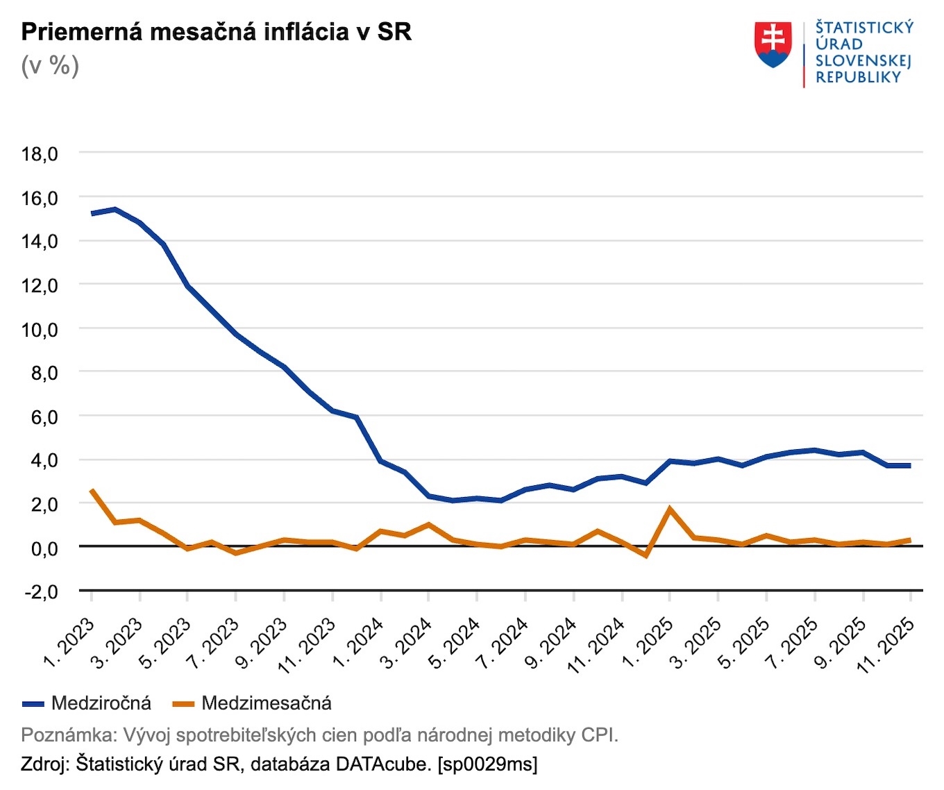 Slovensko v novembri zažilo opakovane najnižšiu úroveň inflácie za celý rok 2025, medziročná miera zdražovania sa ustálila na hodnote 3,7 percenta, rovnakú hodnotu zaznamenal Štatistický úrad aj v apríli a októbri, čo naznačuje určité spomalenie cenového rastu, no odborníci upozorňujú, že situácia nie je taká jednoduchá a radosť zo spomalenia je len dočasná.