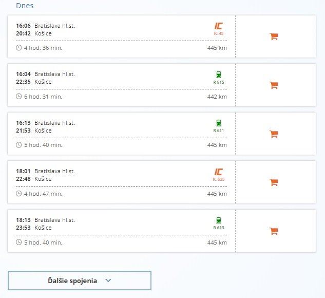 Stránka vyhodnotí vami požadované špecifiká cesty, ponúkne vám vlaky a čas ich odchodov. V rámci zadaného času dostanete na výber najbližšie vlakové spojenia, z ktorých si môžete vybrať, alebo kliknúť na - Ďalšie spojenia - a vybrať si neskorší odchod vlaku. Keď si vyberiete ten správny, kliknete na nákupný košík. Následne si ešte môžete skontrolovať trasu, typ vlaku a obsadenosť, potom už len kliknete na - Kúpiť lístok.