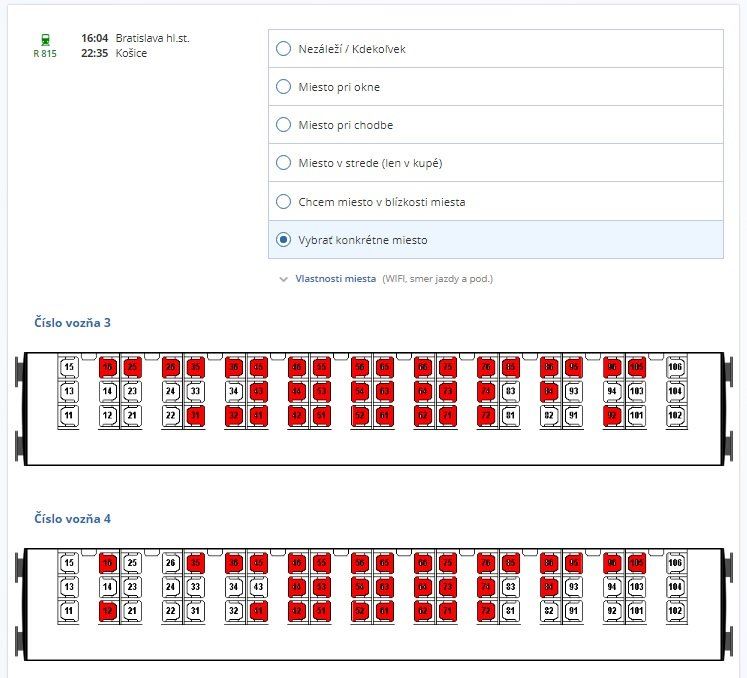 Keďže nechceme z Bratislavy do Košíc stáť na chodbe preplneného vlaku, zvolili sme si 2. triedu s miestenkou. Následne dostaneme ponuku na - Výber miesta. Z jednotlivých možností si môžeme vybrať náhodné miesto, miesto pri okne kdekoľvek vo vlaku, miesto pri chodbe kdekoľvek vo vlaku, miesto v strede (len v kupé vozni), výber konkrétneho vozňa a čísla miesta, a nakoniec výber konkrétneho miesta z plániku jednotlivých vozňov.