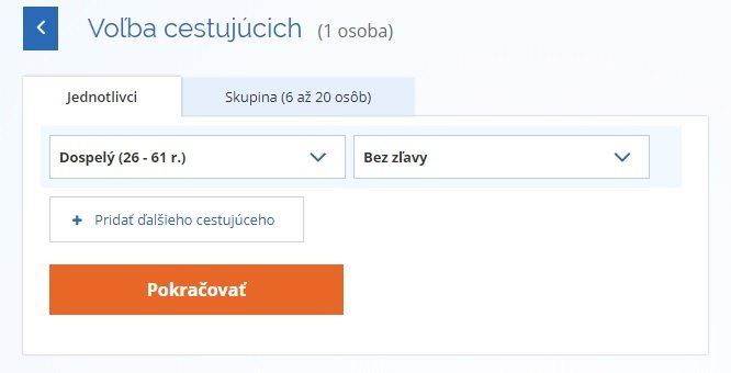 Ďalej vyberáte počet cestujúcich, typ cestujúceho v rámci veku a prípadnú zľavu na cestovné. V týchto možnostiach môžete pridávať aj ďalších cestujúcich, prípadne kupovať lístok pre celú skupinu v rozmedzí 6 až 20 osôb. Keď výber dokončíte, kliknete na - Pokračovať.