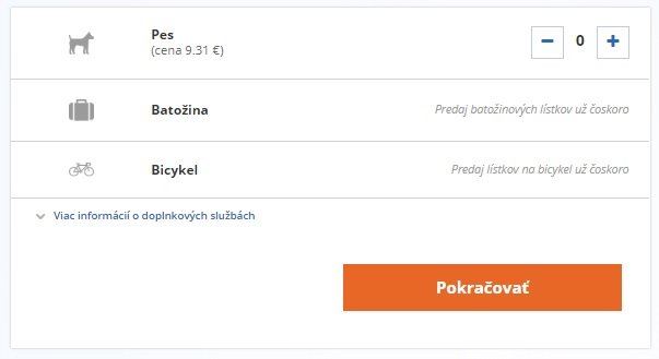 V ďalšom kroku si budete môcť vybrať aj niektoré doplnkové služby ako lístok pre psa, batožinový lístok, prípadne lístok na prepravu bicykla. Po výbere opäť kliknete na - Pokračovať.