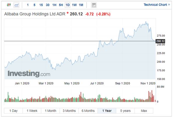 Akcie spoločnosti počas uplynulého týždňa klesli o 7 percent z 285 USD za akciu na 265 USD za akciu po tom, čo si Jack Ma verejne dovolil kritizovať čínsku komunistickú vládu. Zaujímavé je, že práve po tejto udalosti burzy zrušili pripravovanú primárnu emisiu akcií Ant Group s tým, že ako oficiálny dôvod uviedli zmenu regulácie.