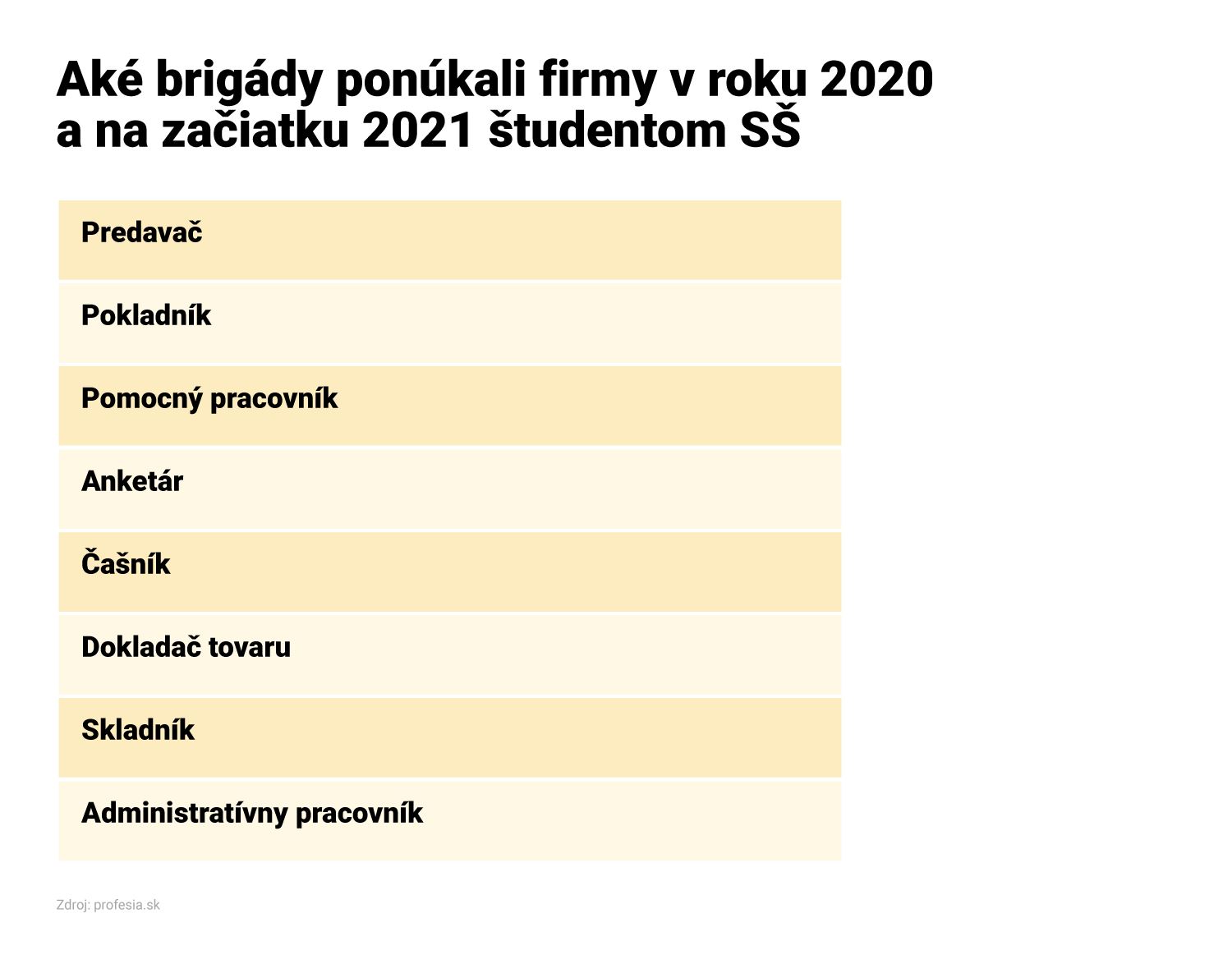 Spomedzi brigádnických ponúk, ktoré sú vhodné najmä pre stredoškolských študentov ide najmä o pozície predavačov, pokladníkov, pomocných pracovníkov, anketárov či čašníkov.