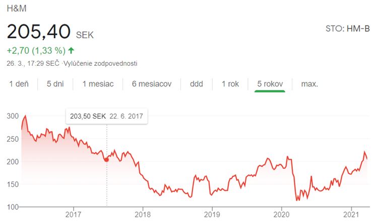 Vývoj hodnoty akcií H&M za posledných 5 rokov. (Zdroj: Google Finance)*