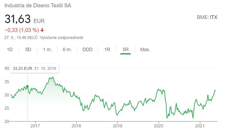 Graf: Vývoj hodnoty spoločnosti Inditex na burze za posledných 5 rokov. (Zdroj: GoogleFinance)