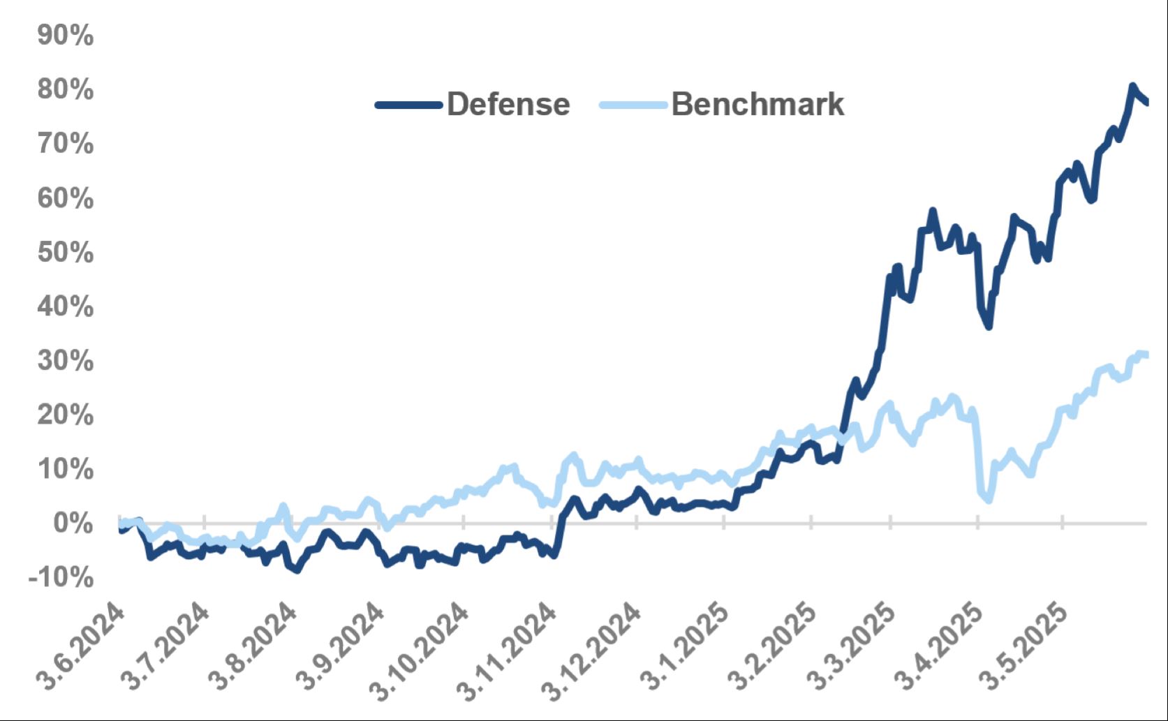 Výkonnosť portfólia Defense za obdobie 2.6.2024 – 3.6.2025 dosiahla +77,6 %, Benchmark (MSCI World Aerospace & Defense): +31,1 %, Alpha: +46,5 %.