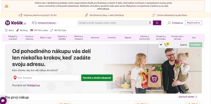 „Vítame vás v skúšobnej prevádzke online supermarketu Košík pre Bratislavu a okolie! V tejto chvíli ladíme sortiment a vychytávame muchy, preto vieme rozviezť len určitý počet objednávok. Našťastie už čoskoro spustíme našu plnú verziu! Ďakujeme za trpezlivosť a tešíme sa na vaše veľkonákupy,“ uvádza e-shop na svojom slovenskom webe.