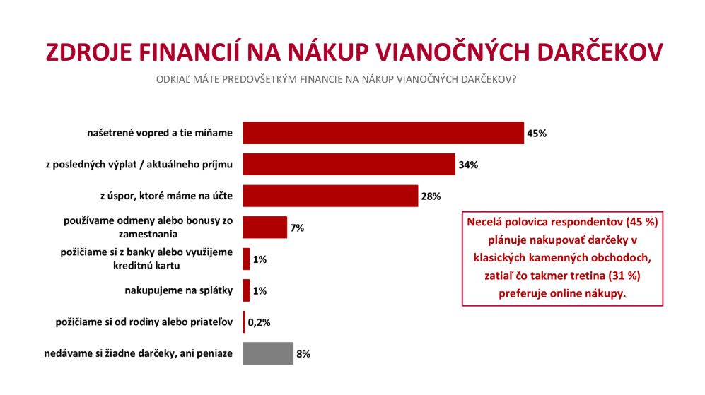 Dobrou správou však je, že Slováci sú pri financovaní sviatkov zodpovednejší. Až 45 % plánuje nakupovať darčeky z našetrených peňazí a len 2 % plánujú využiť úvery alebo kreditné karty. Väčšina domácností si dokonca plánuje ponechať rezervu na obdobie po Vianociach.