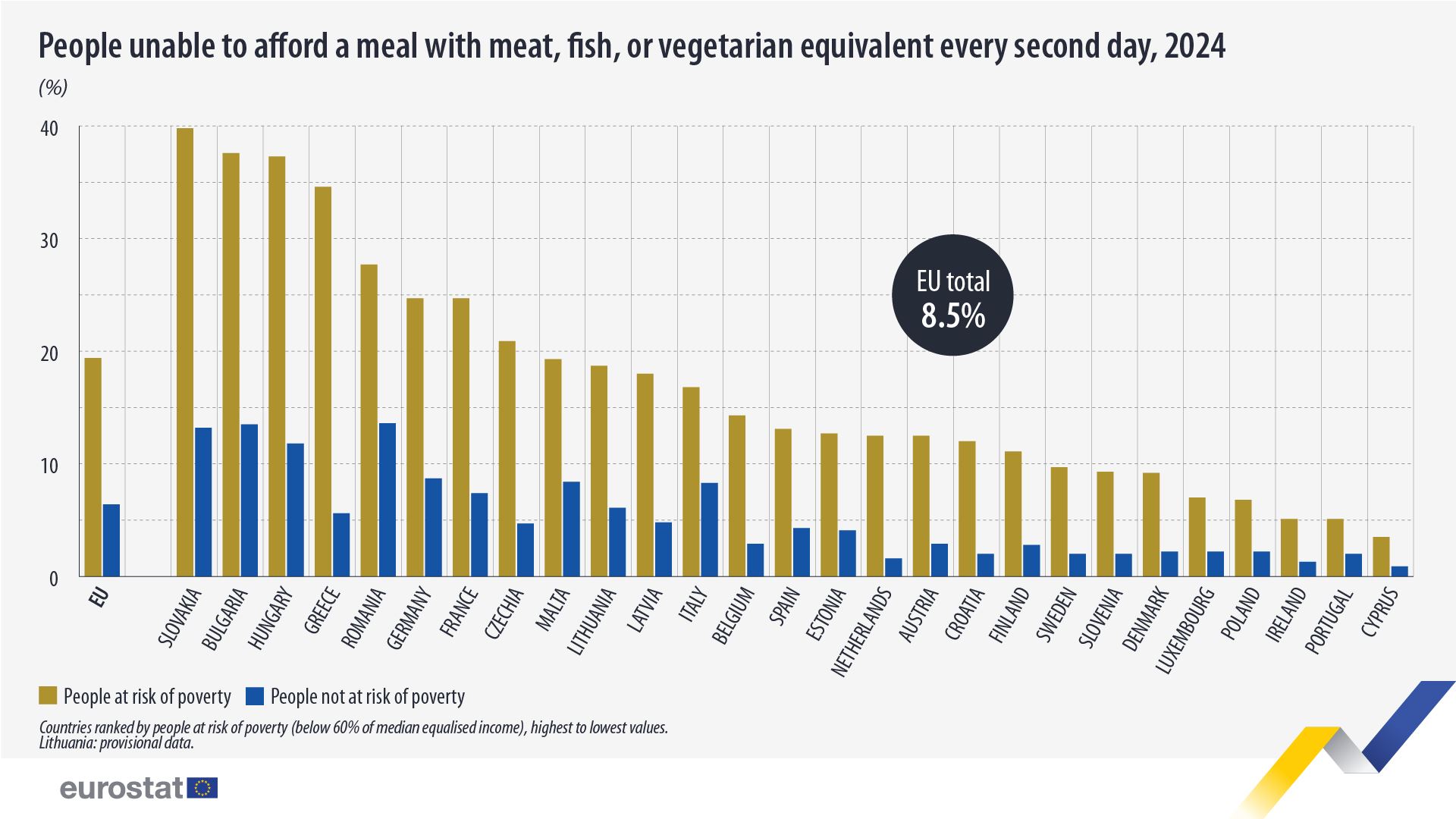 Podľa údajov za rok 2024 si až 8,5 % obyvateľov Európskej únie nemohlo dovoliť jedlo s mäsom, rybou alebo ich vegetariánskou náhradou aspoň každý druhý deň. Hoci ide oproti predchádzajúcemu roku o mierne zlepšenie, problém zostáva veľmi výrazný a zasahuje milióny ľudí.