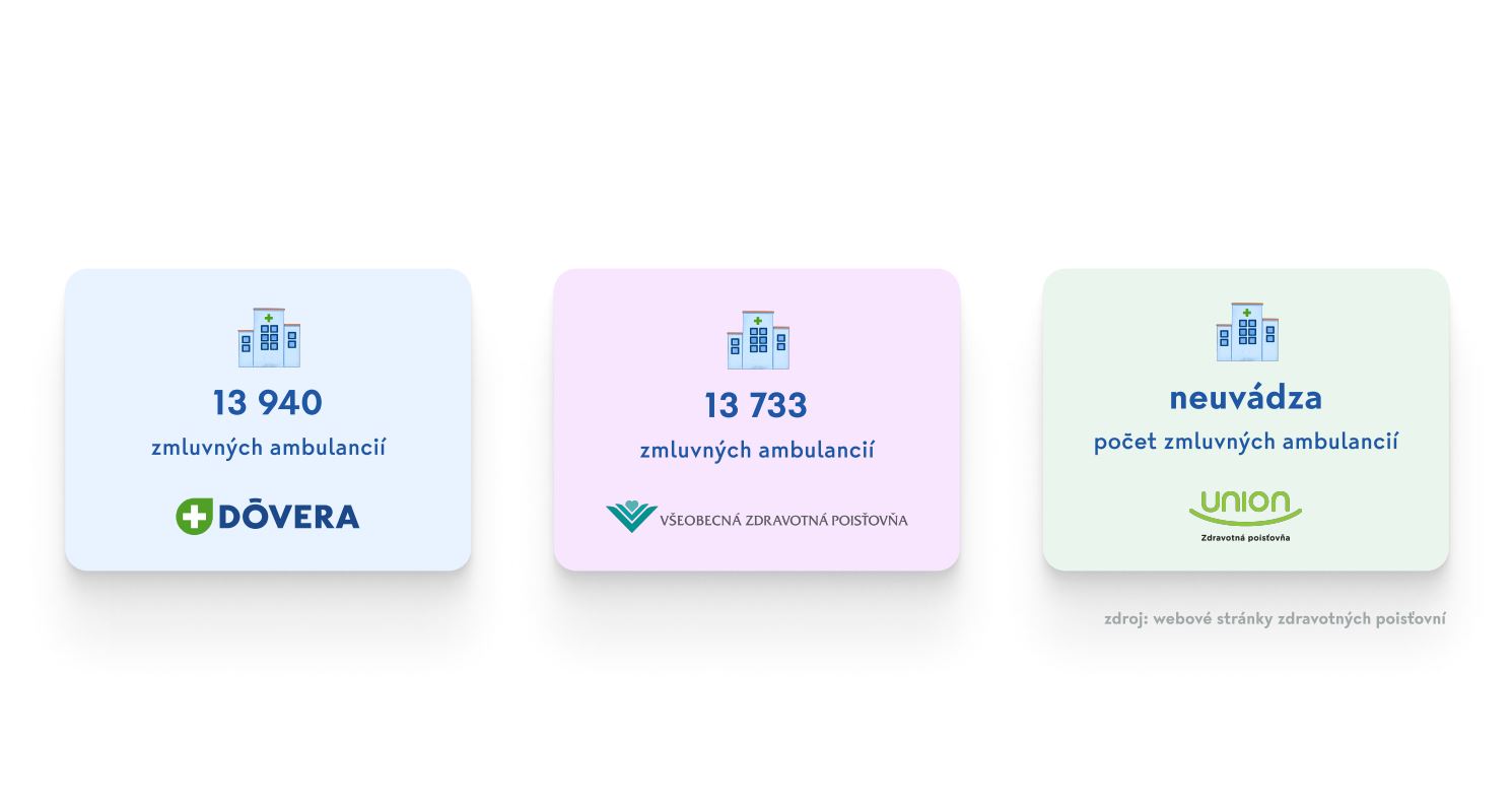 Podľa verejne dostupných údajov z januára tohto roku majú naši poistenci k dispozícii o 207 viac ambulancií všeobecných lekárov a špecialistov ako štátna poisťovňa. Presne je to 13 940 zmluvných ambulancií Dôvery oproti 13 733 zmluvným ambulanciám VšZP. Dáta Unionu sme nenašli v primeranej miere zverejnené.