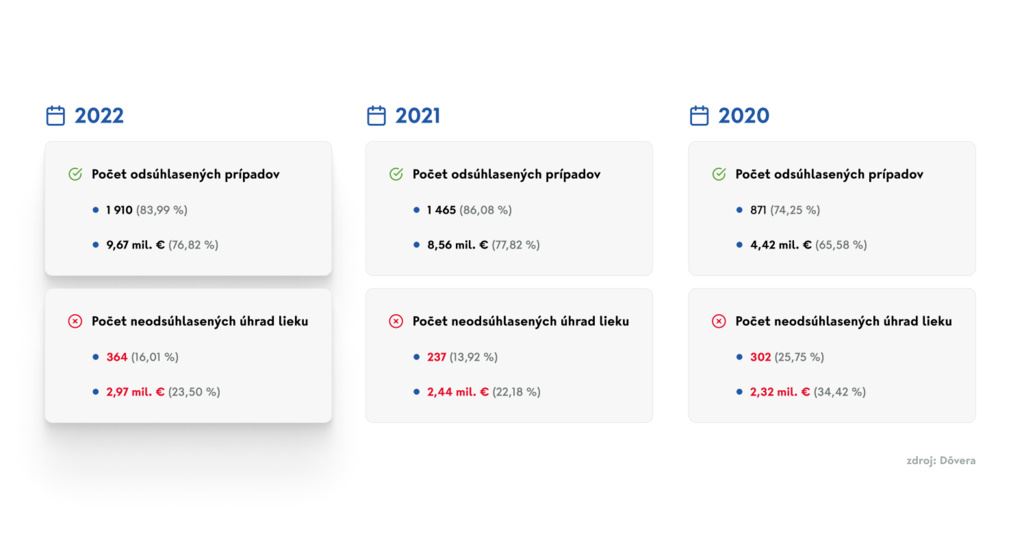 Ak sa pozrieme na čísla nižšie, vidíme, že viac ako 8 z 10 žiadostí o lieky na výnimku v Dôvere schválime. Považujeme však za nesprávne, že nie je jasne stanovený nárok pacienta, teda na úhradu akej liečby má nárok, a na ktorú už nie. Chce to odvahu, ktorú politici doposiaľ nenašli.
