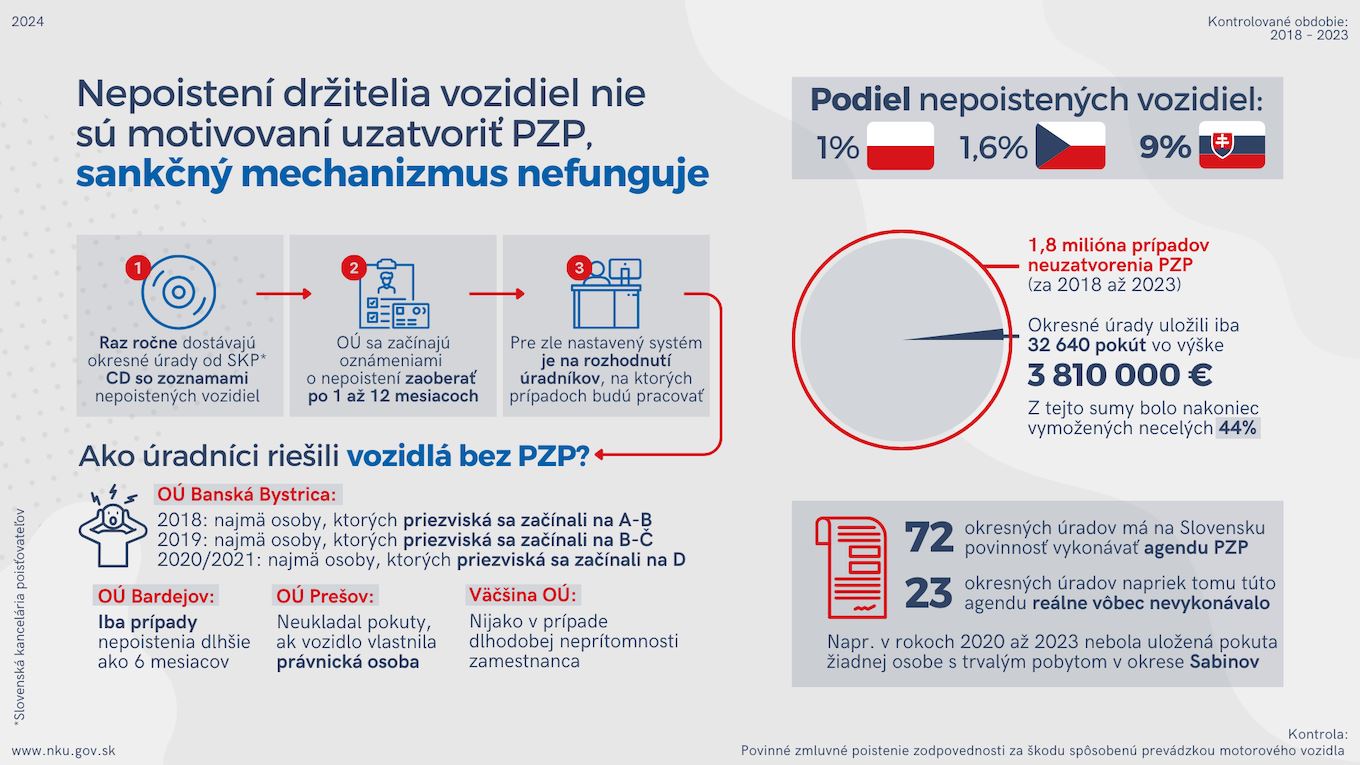Dokazujú to najnovšie zistenia, o ktorých informuje Najvyšší kontrolný úrad SR (NKÚ). Ročne okresné úrady na Slovensku prijmú približne 300-tisíc oznámení o neuzatvorení povinného zmluvného poistenia (PZP). Napriek tomu je za toto porušenie pokutovaná len malá časť majiteľov vozidiel. Podľa kontroly Najvyššieho kontrolného úradu (NKÚ) SR je príčinou tejto situácie zle nastavený kontrolný a sankčný systém, ktorý krajinu technicky drží v minulom storočí.